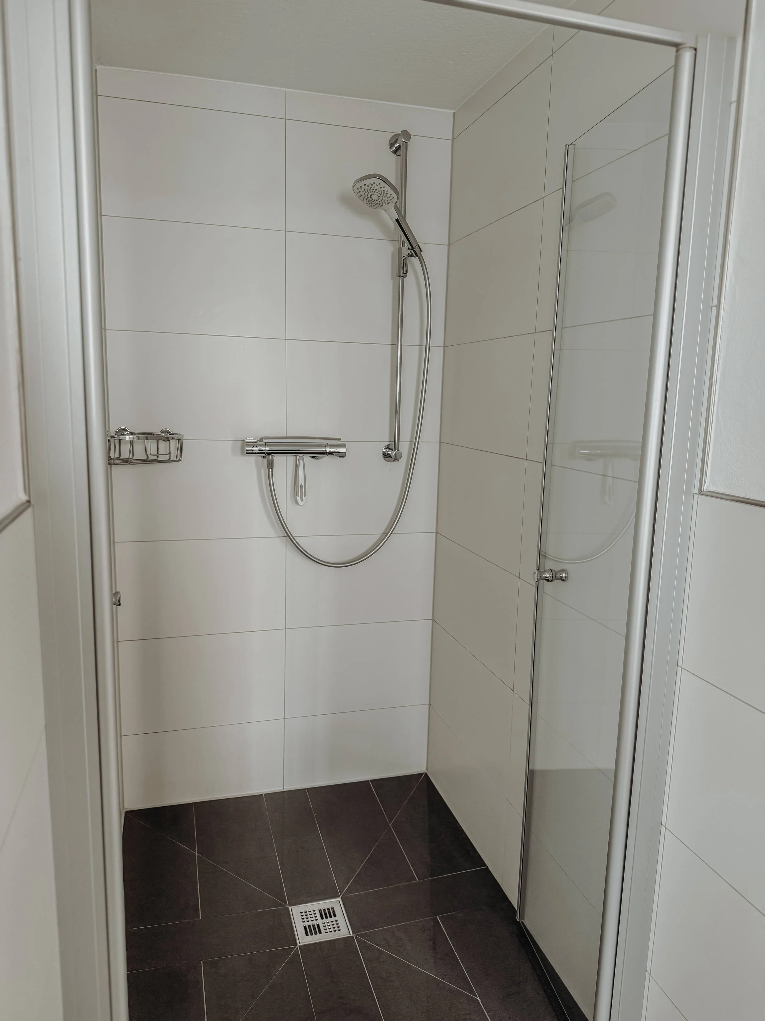 Modernes Bad mit Dusche sowie Föhn